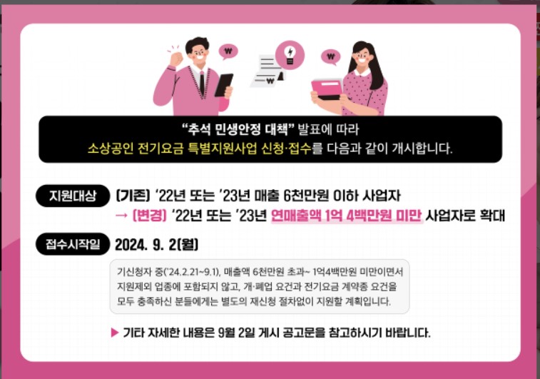 또한, 기존 신청자 중(2024.02.21~2024.09.01), 매출액이 6000만 원을 초과하면서 1억 400만 원 미만이고 지원제외 업종에 해당이 되지 않고, 개업과 폐업 요건과 전기요금 계약종 요건에 모두 해당이 되신다면 별도로 신청을 다시 해야 하는 불편함이 없도록 지원을 한다고 합니다.