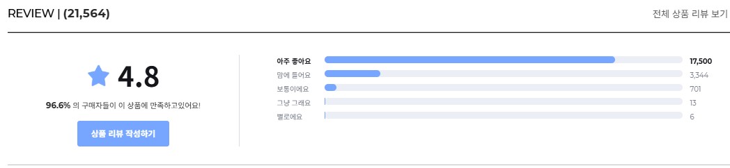후기들이 대체로 매우 좋아요 무려 96.6%가 만족한 제품이라고 하니 더 바랄 게 없네요.^^