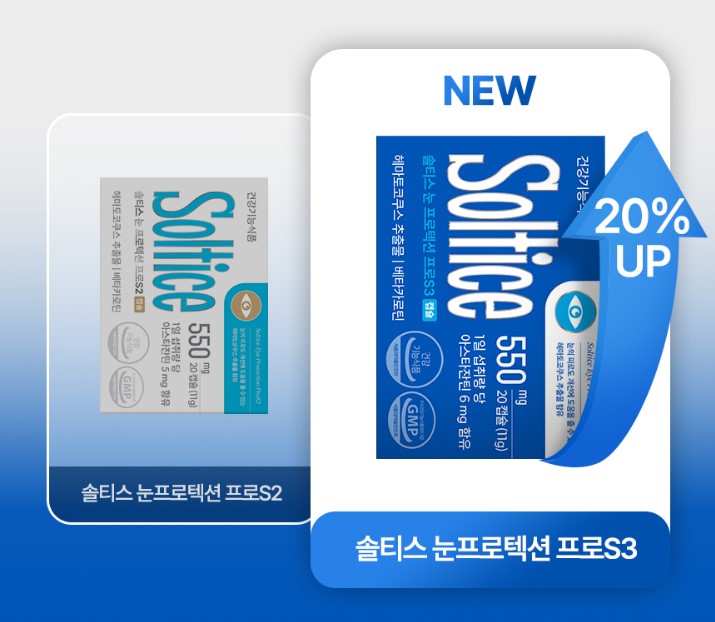3월에 새로 리뉴얼된 솔티스 눈프로텍션 프로 S3는 아스타잔틴 함량이 솔티스 눈프로텍션 프로 S2보다 무려 20%나 더 상승했더라고요 ㅎㅎ
