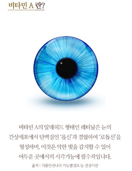비타민 A는 어두운 곳에서 시각 적응을 위해 필요하고, 피부와 점막을 형성하고 기능을 유지하는데 필요하며, 상피세포의 성장과 발달에 필요한 성분입니다.