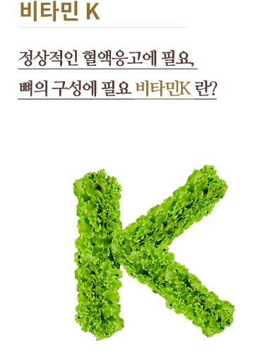 비타민K 혈액응고와 뼈의 구성에 도움을 주는 지용성 비타민으로 비타민 K1은 시금치와 같은 녹황색 채소나 해초에 많이 들어 있습니다. 불규칙한 식습관을 가지고 있거나 부실한 식습관을 가지고 있을 경우 섭취하지 못할 수 있습니다.